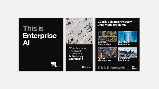 With a change agent like Siebel at the helm, everything we created together—from design systems and website landing pages to digital banners—needed to reflect the founder’s future-shaping point of view. Strategy and messaging required a tone of confidence, credibility, and empathy. The typography had to be clear and unfussy. We deliberately eschewed color in all graphics to speak with clarity and boldness. This muscular messaging vocabulary projects strength across C3 AI’s digital ads, out-of-home ads, radio scripts, print communications, broadcast spots, and videos. Even the punctuation is intentional—all sentences end with a period. Everything C3 AI does is about making a firm and unequivocal statement.